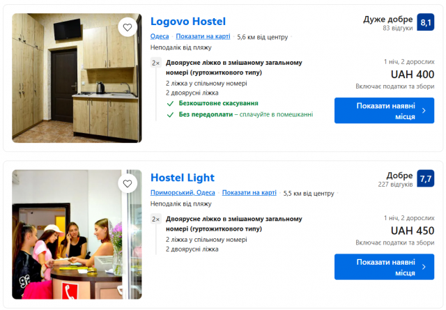 Цены в хостелах стартуют от 400 гривен за койко-место в общем номере, при этом расстояние до моря составляет более 5 км, по данным Booking.ua. В хостелах ближе к центру стоимость стартует от 500 гривен в сутки с человека в многоместном номере.