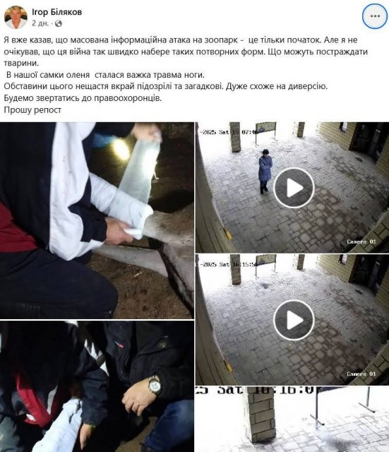 После публикации видео директор зоопарка Игорь Биляков показал, как животному накладывают шину и оказывают медицинскую помощь. Также Биляков заявил о «диверсии» — будто кто-то из посетителей специально сломал ногу самке оленя, чтобы потом обвинить зоопарк в халатности. История странная и запутанная, но главное, что животному оказали помощь.