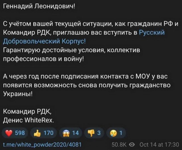 «Геннадий Леонидович! С учетом вашей текущей ситуации, как гражданин РФ и Командир РДК, приглашаю вас вступить в Русский Добровольческий Корпус! Гарантирую достойные условия, коллектив профессионалов и войну! А через год после подписания контракта с МОУ у вас появится возможность снова получить гражданство Украины!», – написал командир РДК. Но сегодня этот пост уже удалён. Пожалуй, предложение было с ограниченным временем – Труханов так и не воспользовался им. Теоретически, Труханов может воспользоваться этой нормой в законе, чтобы восстановить гражданство Украины.