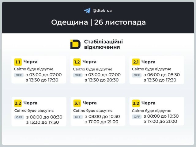Графіки відключення світла в Одесі та на Одещині на 26 листопада опублікув ДТЕК.