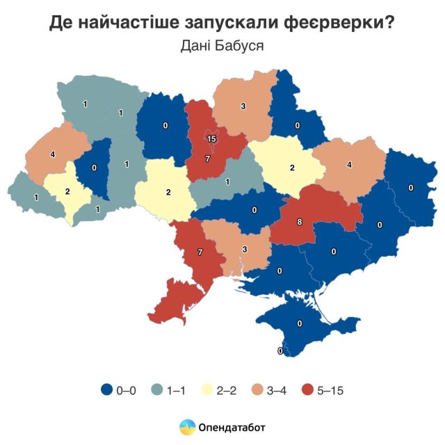Найчастіше феєрверки лунають у столиці — майже кожен четвертий вирок. Далі йдуть Дніпропетровська та Одеська області — у нашому регіоні зафіксовано сім справ. Разом ці регіони зібрали майже половину всіх судових рішень.
