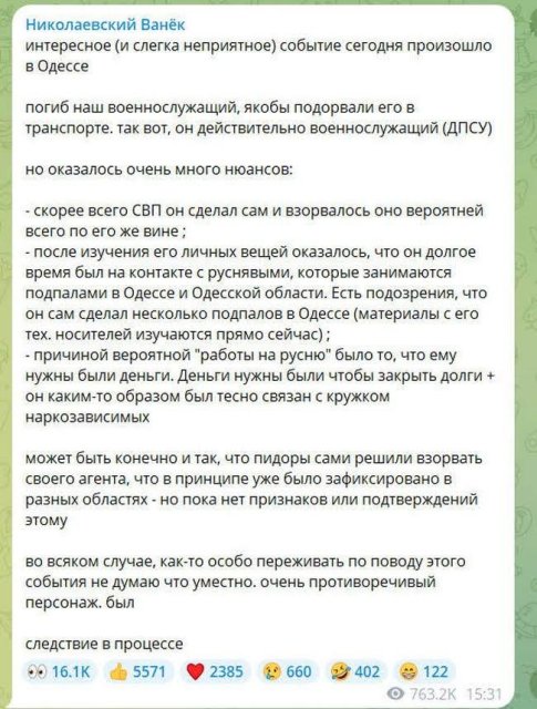 Неофициальные источники начали постепенно сообщать подробности взрыва в Одессе сегодня 6 февраля, во время которого погиб 21-летний мужчина. Так телеграмм-канал «Николаевский ванёк», связанный с украинской разведкой и ПВО сообщил, что погиб военнослужащий — пограничник.
