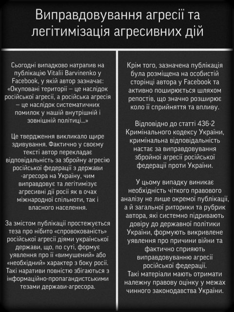 Крім того, зазначена публікація була розміщена на особистій сторінці автора у Facebook та активно поширюється шляхом репостів, що значно розширює коло її сприйняття та впливу. Відповідно до статті 436-2 Кримінального кодексу України, кримінальна відповідальність настає за виправдовування збройної агресії Російської Федерації проти України», — відзначив Вербицький.