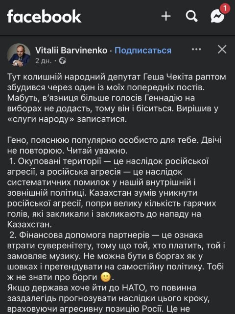 ексголови Одеської міської ради Віталія Барвіненко, де той стверджує, що: «Окуповані території — це наслідок російської агресії, а російська агресія — це наслідок систематичних помилок у нашій внутрішній і зовнішній політиці…».