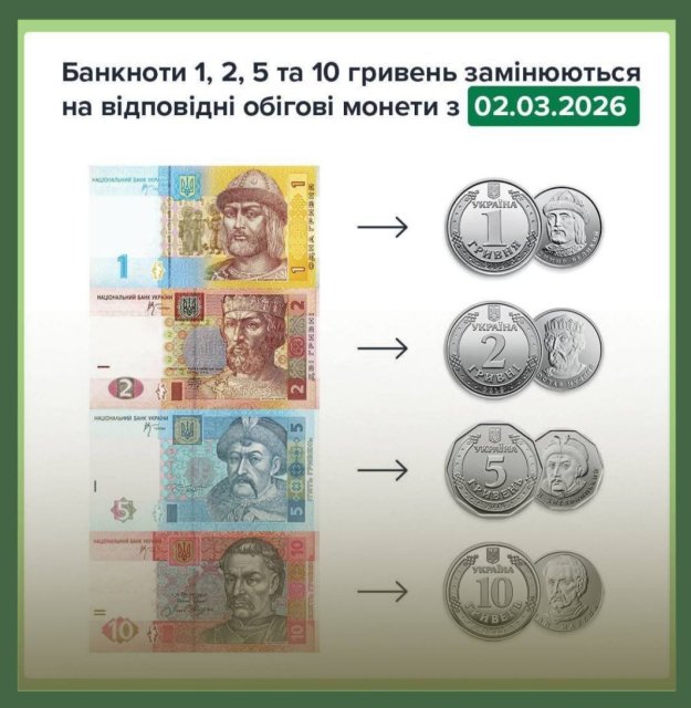 Паперові банкноти номіналами 1, 2, 5 і 10 гривень зразків 2003-2007 рр. офіційно перестануть приймати. Їх повністю замінять відповідними монетами. Про це повідомляється з посиланням на пресслужбу Національного банку України.