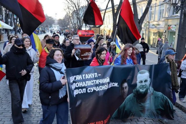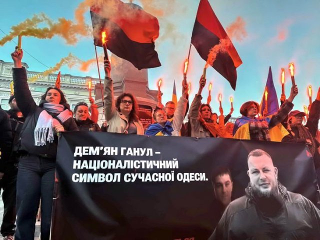 В честь Демьяна Ганула вчера в Одессе состоялось шествие нескольких десятков молодых людей с факелами, флагами и баннером с портретом патриота, где было написано: «Демьян Ганул — националистический символ современной Одессы».