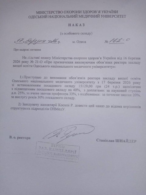 Тимчасово виконуючим обов’язки ректора одеського Медуніверситету став завідувач кафедри стоматології Станіслав Шнайдер.