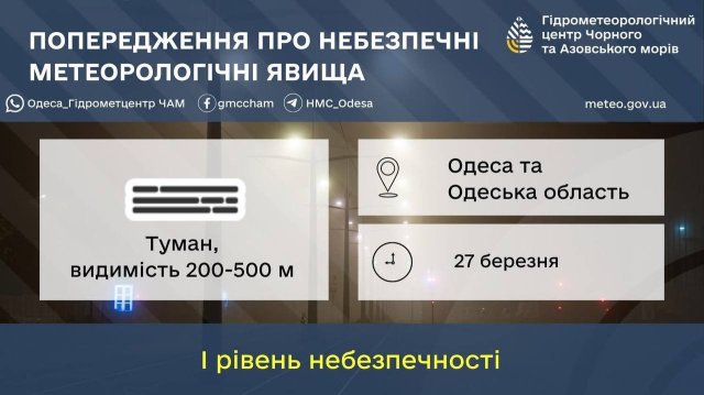 Вздовж узбережжя Одещини вночі та вранці 27 березня очікується туман, видимість 500-1000 м.
