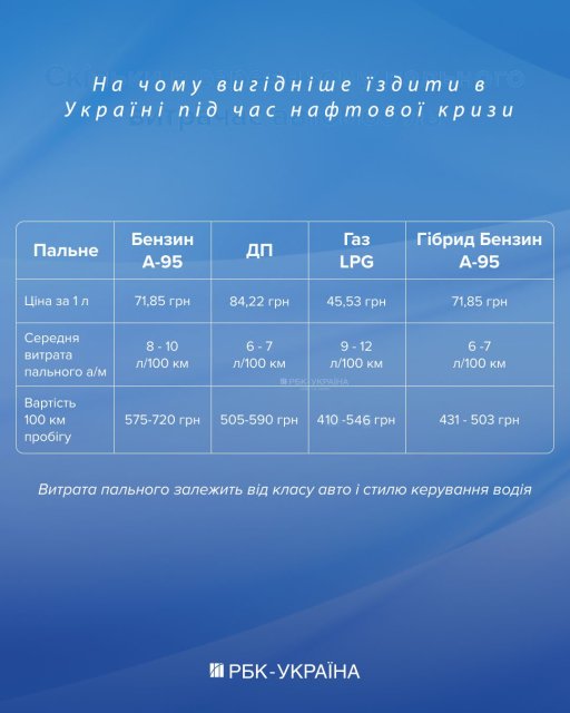Вартість 100 км пробігу на основі середніх цін на 24.03.2026 (інфографіка РБК-Україна)