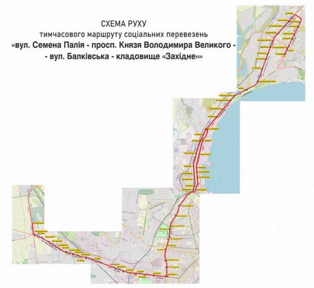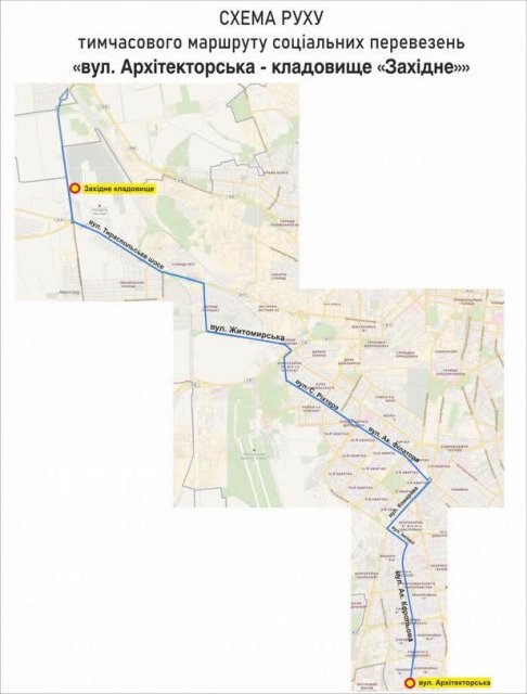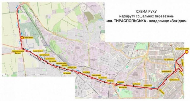 Социальный (бесплатный) автобусный маршрут сообщением ул. Архитекторская – кладбище «Западное». Автобусы в прямом направлении будут двигаться через ул. Ак. Королева, ул. Инглеге, ул. М. Комарова, пл. Трибуны Героев, ул. Академика Филатова, пл. Бориса Деревянко, ул. Святослава Рихтера, ул. Житомирское, Тираспольское шоссе, кладбище «Западное» и обратно.