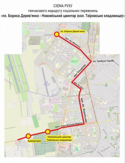Социальный (бесплатный) автобусный маршрут сообщением «пл. Бориса Деревянко – Таировское кладбище». Автобусы в прямом направлении будут двигаться через ул. Академика Филатова, пл. Трибуны Героев, ул. М. Комарова, ул. Инглеге, ул. Ак. Королева, просп. Князя Ярослава Мудрого (кол. просп. Академика Глушко) к Таировскому кладбищу, разворот на светофоре ж/к «Розенталь» и обратно.